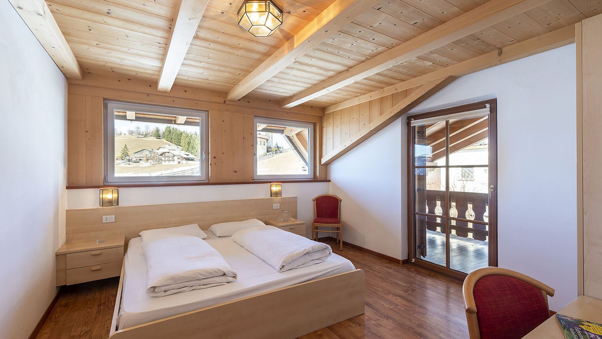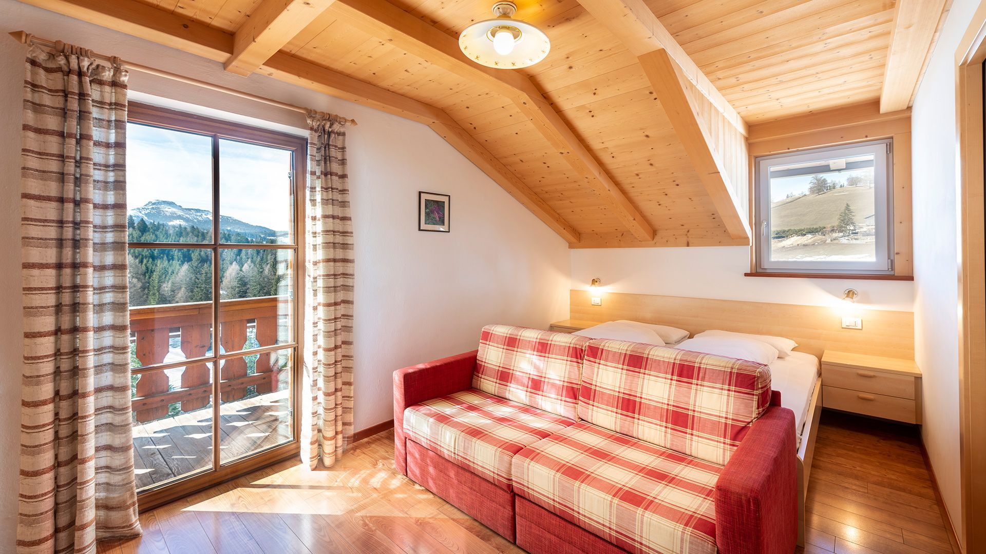 Die Gästezimmer Richtung Süden verfügen über einen Balkon mit bezaubernder Aussicht auf die umliegenden Berggipfel der Dolomiten und den saftigen grünen Wäldern und Wiesen.